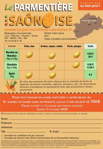Le 11/10/2025 à Fleurey lès Faverney Portes ouvertes à la parmentière saônoise ![]() Vente de pommes de terre et légumes Exposants Repas (pas de réservation ) Site internet : https://www.facebook.com/pdtdehaute... |