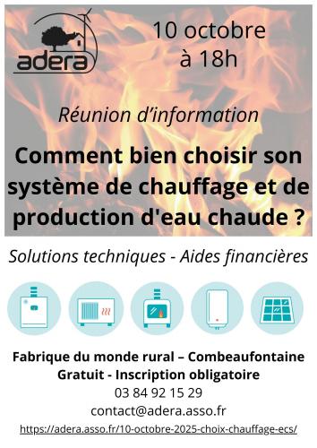 Le 10/10/2025 à Combeaufontaine Réunion d'information : Comment bien choisir son système de chauffage et de production d’eau chaude ? ![]() Cette réunion d’information permettra d’aborder tous ces aspects, pour que vous puissiez faire les bons choix en fonction de votre logement, de vos attentes et de vos contraintes. Gratuit et ouvert à tous Date : vendredi 10 octobre 2025 Horaires : 18h00 Lieu : ADERA – Fabrique du monde rural – 47 Grande rue 70120 Combeaufontaine Plus d'informations : https://adera.asso.fr/10-octobre-2025-choix-chauffage-ecs/ Inscription obligatoire : - https://framaforms.org/inscription-a-la-reunion-dinformation-comment-bien-choisir-son-systeme-de-chauffage-et-de-production - ou contact@adera.asso.fr - ou 03 84 92 15 29 (du lundi au vendredi de 9h à 12h et de 13h45 à 17h30) Site internet : https://adera.asso.fr/10-octobre-20... |
