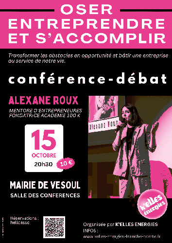 Le 15/10/2025 à Vesoul Conférence-débat : Oser entreprendre et s'accomplir ![]() 📅 Mardi 15 octobre 2024 à 20h30 📍 Salle des conférences – Mairie de Vesoul 👉 Lien d’inscription : HelloAsso – Conférence Alexane Roux Au programme : Découvrir un parcours entrepreneurial sans filtre : réussites, galères et rebonds, Trouver des clés concrètes pour accélérer la croissance de son entreprise, Se connecter à un réseau de femmes qui osent entreprendre. Un moment fort pour faire le plein d’énergie, d’idées et repartir avec un nouvel élan ! Site internet : https://www.helloasso.com/associati... |