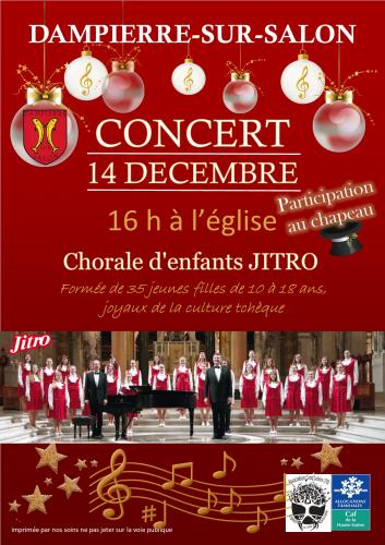 | Le 14/12/2025 à Dampierre sur Salon Concert de Noël Venez partager un moment d'exception le 14 décembre 2025 à l'église de Dampierre-Sur-Salon.La Chorale Jitro, formée de 35 jeunes filles de 10 à 18 ans, est l’un des joyaux de la culture tchèque de renommée mondiale, Entrée libre - Participation au chapeau |