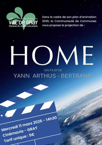 | Le 11/03/2026 à Gray Projection : Home, un film de Yann Arthus-Bertrand La Communauté de Communes Val de Gray propose la projection du film Home de Yann Arthus-Bertrand dans le cadre de son Plan d’animation 2026. Ce documentaire engagé met en lumière la beauté de la planète et les enjeux liés à sa préservation.La projection se déroulera le mercredi 11 mars à 14h30 au Cinémavia à Gray. Tarif : 5 ¤ par personne. Site internet : https://www.cc-valdegray.fr/ |