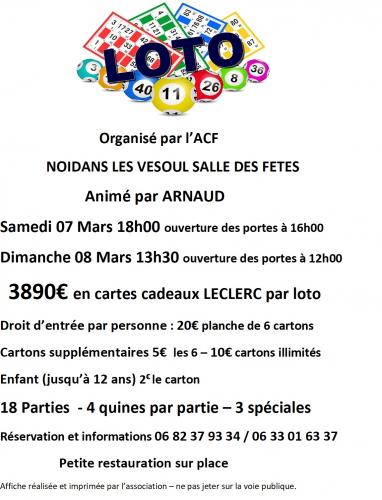 | Du 07/03/2026 au 08/03/2026 à Noidans lès Vesoul Loto organise par l'ACF noidans les Vesoul Animé par ARNAUDSamedi 07 Mars 18h00 ouverture des portes à 16h00 Dimanche 08 Mars 13h30 ouverture des portes à 12h00 3890¤ en cartes cadeaux LECLERC par loto Droit d’entrée par personne : 20¤ planche de 6 cartons Cartons supplémentaires 5¤ les 6 – 10¤ cartons illimités Enfant (jusqu’à 12 ans) 2¤ le carton 18 Parties - 4 quines par partie – 3 spéciales Réservation et informations 06 82 37 93 34 / 06 33 01 63 37 Petite restauration sur place |