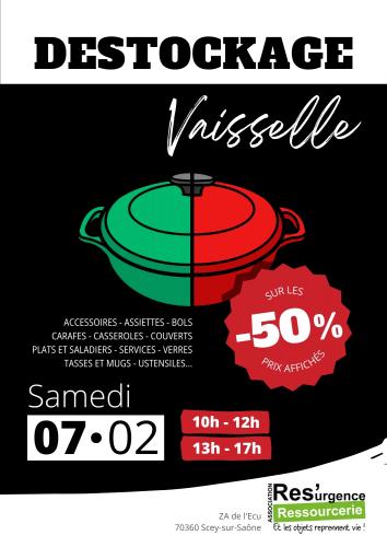 | Le 07/02/2026 à Scey sur Saône et Saint-Albin Destockage vaisselle La ressourcerie Res’urgence organise un déstockage sur tout son rayon vaisselle le samedi 7 février. Assiettes, verres et autres objets du quotidien seront proposés à -50 % sur les prix affichés, dans une ambiance de chasse aux trésors du réemploi. Lieu : Ressourcerie Res'urgence, ZA de l'écu, SCEY-SUR-SAONE |