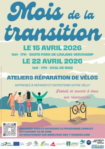 | Le 15/04/2026 à Loulans Verchamp Ateliers réparation de vélos Les 15 et 22 avril, profitez de deux après-midis gratuits pour apprendre à réparer et entretenir votre vélo avec les intervenants spécialisés de Roues Libres et du Camion à vélos. Inscrivez-vous et venez avec votre vélo !https://docs.google.com/forms/d/e/1FAIpQLSe1mT0IaOuws-PbrtGALYJPvgLcpy6PehB_R81QxUDrW8sVDA/viewform Mercredi 15 avril, 14h - 17h – skate park de Loulans-Verchamp Mercredi 22 avril, 14h - 17h – CCSL de Rioz Site internet : http://www.pays-des-7-rivieres.com/... |