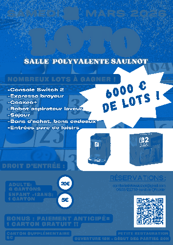 | Le 21/03/2026 à Saulnot Super Loto de Saulnot Super Loto organisé par le comité des fêtes de Saulnot, le samedi 21 Mars 2026 à la salle des fêtes.6000€ de lot !!! Nintendo Switch 2, cookeo, robot aspirateur, machine expresso broyeur, séjours, entrées Parc de loisirs.... Et bien d'autres superbes lots ! Ouverture des portes 18h30, début des parties 20h00 Buvette et petite restauration sur place. Réservation fortement conseillée. (Voir affiche jointe) Site internet : https://www.facebook.com/share/g/1A... |