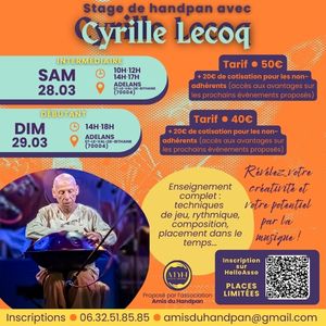 | Du 28/03/2026 au 29/03/2026 à Adelans et le Val de Bithaine Stage de handpan par Cyrille Lecoq À la fin du mois de mars, Cyrille Lecoq nous fait l'honneur de revenir chez les Amis du Handpan pour un nouveau weekend de stage à Adelans-et-le-Val-de-Bithaine (70) ! Au programme : un enseignement complet et accessible à tous... Venez découvrir votre potentiel à travers la musique 🎵✨ Partagez à vos potes panistes 😉. Le samedi 28/03, de 10h à 17h, s'adresse aux joueurs intermédiaires. Le tarif est de 50€ la journée. Le dimanche 29/03, de 14h à 18h, est destiné aux joueurs débutants, pour un tarif de 40€. . Pour les non-adhérents, la cotisation à l'association des Amis du Handpan sera à régler en plus du stage pour pouvoir y participer. Elle vous donnera accès à des avantages sur les prochains événements de l'association, notamment le Castle Handpan Festival 3 ! . Instrument personnel souhaité. . Inscription par mail, téléphone ou Helloasso Site internet : https://www.helloasso.com/associati... |