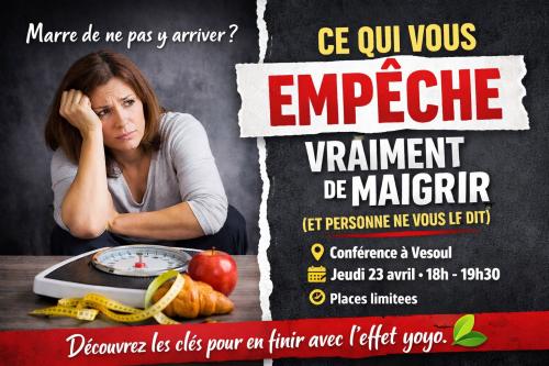 | Le 23/04/2026 à Vesoul Conférence : l'hypnose pour atteindre (et garder !) ton poids de forme. Et si le problème... ce n'était pas toi, mais les régimes ? 🍎Tu as déjà essayé de faire attention... de te reprendre... de "te remotiver"... Mais entre le stress, le travail, la vie de famille — tout finit toujours par reprendre le dessus ? 👉 Et si, cette fois, tu comprenais enfin ce qui bloque vraiment... pour arrêter de lutter contre toi-même. Lors de cette conférence conviviale à Vesoul, je te partagerai une approche différente, plus humaine, plus durable 💫 ✨ Au programme : ✅ Pourquoi 95 % des régimes échouent (et pourquoi ce n'est pas un manque de volonté) 🧠 ✅ Ce qui déclenche réellement les craquages... et comment reprendre le contrôle sans frustration ✅ Les 3 piliers essentiels de la méthode Transe-Formée pour retrouver un poids de forme durablement, sans se priver 🌿 💬 Un moment chaleureux, sans jugement, avec des personnes qui vivent les mêmes défis que toi. 📅 Jeudi 23 avril – 18h à 19h30 📍 Vesoul 💶 Participation : 10 ¤ (places limitées) 💖 Tu mérites de te sentir bien dans ton corps... sans pression, sans culpabilité. 👉 Les places sont volontairement limitées pour garder un moment d'échange de qualité. Réserve ta place dès maintenant ! |