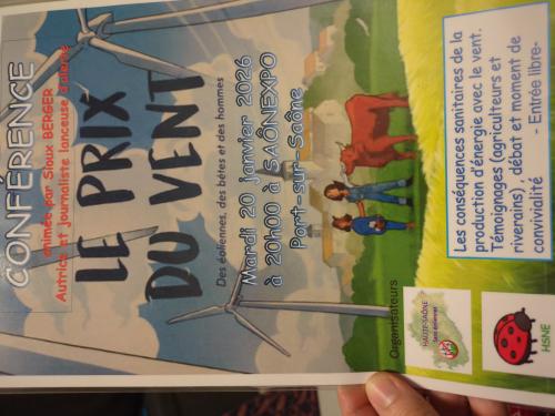 | Le 20/01/2026 à Port sur Saône Le prix du vent, conférence-débat Sioux Berger est journaliste lanceuse d'alerte et autrice du livre 'Le prix du vent'. Elle abordera les conséquences sanitaires de la production d'énergie avec le vent.Conférence débat suivie d'un moment de convivialité. Entrée libre et gratuite Le mardi 20 janvier à 20h00 À SAONEXPO à Port sur Saône |