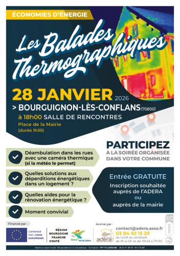 | Le 28/01/2026 à Bourguignon lès Conflans Balade thermographique Balade sous la forme d’une déambulation (si les conditions météo le permettent) dans la rue avec un conseiller de l’ADERA équipé d’une caméra thermique. Les défauts constatés, les solutions à apporter et les aides financières à la rénovation seront abordés.Les aides existantes en matière de rénovation énergétique seront présentées par le conseiller. Primes des fournisseurs d’énergie (CEE), MaPrimeRénov’ par geste, MaPrimeRénov’ Parcours accompagné, éco-prêt à taux 0, ... ça sera l’occasion de répondre à vos questions et de vous expliquer comment s’y retrouver dans tout ça. Le Pays de Vesoul - Val de Saône présentera son cadastre solaire. Organisé par le Pays de Vesoul - Val de Saône grâce au soutien financier du programme européen LEADER et de la Région Bourgogne-Franche-Comté. Site internet : https://adera.asso.fr/hiver-2025-20... |