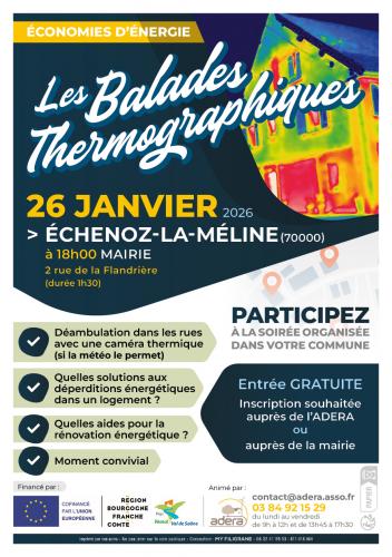 | Le 26/01/2026 à Echenoz la Méline Balade thermographique Balade sous la forme d’une déambulation (si les conditions météo le permettent) dans la rue avec un conseiller de l’ADERA équipé d’une caméra thermique. Les défauts constatés, les solutions à apporter et les aides financières à la rénovation seront abordés.Les aides existantes en matière de rénovation énergétique seront présentées par le conseiller. Primes des fournisseurs d’énergie (CEE), MaPrimeRénov’ par geste, MaPrimeRénov’ Parcours accompagné, éco-prêt à taux 0, ... ça sera l’occasion de répondre à vos questions et de vous expliquer comment s’y retrouver dans tout ça. Le Pays de Vesoul - Val de Saône présentera son cadastre solaire. Organisé par le Pays de Vesoul - Val de Saône grâce au soutien financier du programme européen LEADER et de la Région Bourgogne-Franche-Comté. Site internet : https://adera.asso.fr/hiver-2025-20... |