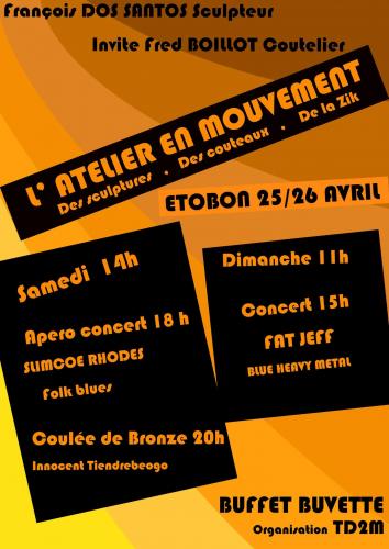| Du 25/04/2026 au 26/04/2026 à Etobon L' atelier en mouvement François Dos Santos ouvre son atelier de sculptures les 25 et 26 avril a Etobon 70400Le samedi 25 avril ouverture à 14 h expo, démo. 18 h apéro concert Slimcoe Rhodes ( folk blues ) 20 h coulée de bronze avec Innocent et ses stagiaires Le dimanche 26 avril ouverture 11 h expo, démo 15 h concert Fat Jeff ( Blues heavy metal) Infos pratiques : Entrée libre Concerts au chapeau Buvette Planches apero Gaufres Parking derrière la mairie |
