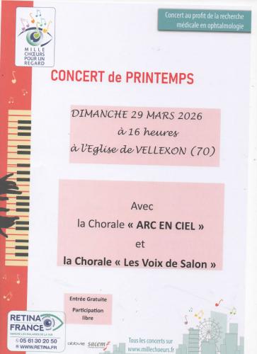 | Le 29/03/2026 à Vellexon, Queutrey et Vaudey concert "Mille choeurs pour un regard" la chorale" les voix du Salon "proposera un concert au benefice de retina france ds le cadre de l'opération nationale "1000 choeurs pour un regard " à laquelle elle participe régulièrement de puis de nombreuses annéesle concert aura lieu en l'eglise de vellexon le dimanche 29 mars à 16 h entree libre (chapeau) la chorale" les voix du Salon" dirigée par Stéphane Billod reçoit à cette occasion la chorale "arc en ciel" dirigée par Me Christine Maussire |