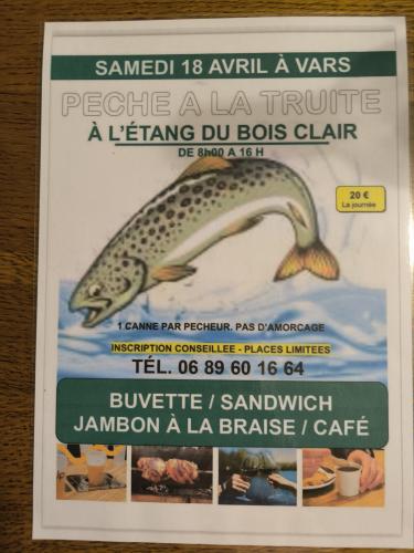| Le 18/04/2026 à Oyrières Pêche à la truite Pêche à la truite à l étang du bois clair De 8h a 16h 20 euros la journée Possibilité de repas jambon a la braise fromage dessert 12 euros Buvette et sandwich Place limite sur réservation 0689601664 ou 0757423490 |