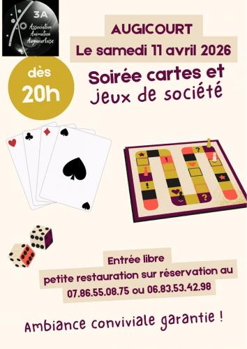 | Le 11/04/2026 à Augicourt jeux de cartes et sociétés Soirée jeux de cartes et jeux de sociétés le samedi 11 avril à 20H00 à la salle des fêtes à Augicourt ( 70 ). Age de 1 à 99 ans.Petite restauration et buvette. Inscription au plus tard le 10 avril. |