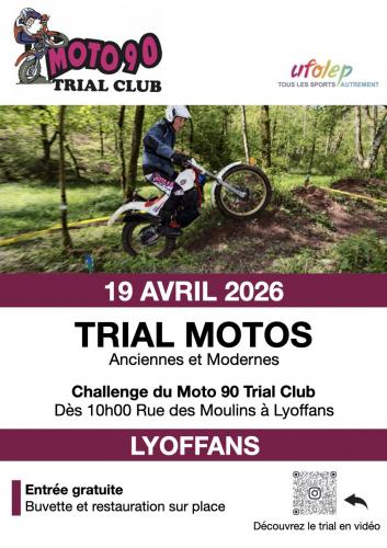 | Le 19/04/2026 à Lyoffans Trial Moto 👋 Bonjour à tous !Challenge Moto 90 Trial Club le Dimanche 19 Avril 2026 à📍Lyoffans (70200) Venez profiter d’une journée de pilotage et de spectacle dans une ambiance conviviale 🔥 🍔 Buvette et restauration sur place 🎟 Entrée gratuite Que vous soyez passionné de trial, motard ou simple curieux, vous êtes les bienvenus ! 👉 N’hésitez pas à partager et à venir nombreux Site internet : https://moto90-trialclub.kalisport.... |