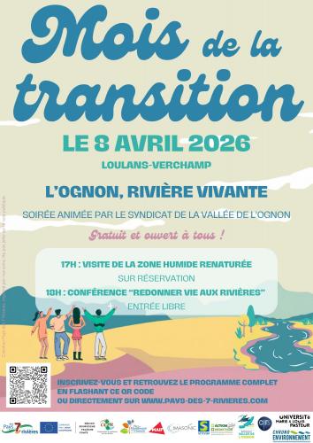 | Le 08/04/2026 à Loulans Verchamp L'Ognon, rivière vivante Le Syndicat de la Vallée de l'Ognon vous emmène découvrir la zone humide restaurée avec succès de Loulans-Verchamp : une balade immersive suivie d'un décryptage des milieux aquatiques.17h : visite commentée de la zone humide restaurée. Découvrez comment la rivière a retrouvé son lit naturel et toute la faune qui a recolonisé les lieux. Inscrivez-vous ci-dessous et prévoyez vos bottes ! https://docs.google.com/forms/d/e/1FAIpQLSe1mT0IaOuws-PbrtGALYJPvgLcpy6PehB_R81QxUDrW8sVDA/viewform 18h : conférence "A la reconquête des milieux humides : redonner vie aux rivières". Cette conférence évoquera les caractéristiques d'une rivière, comment elles peuvent être détériorées et comment, aujourd'hui, les restaurations influencent et restaurent les processus naturels. Toute la faune présente autour de l'Ognon sera également évoquée. Entrée libre. Site internet : http://www.pays-des-7-rivieres.com/... |