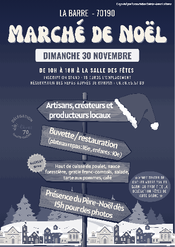 | Le 30/11/2025 à Barre (La) Marché de Noël à La Barre Dimanche 30 novembre de 10h à 18h, marché de Noël à la salle des fêtes de La Barre.Artisans, créateurs, producteurs locaux, buvette, restauration et la présence du Père Noël à 15h pour la photo souvenir. Site internet : https://tourisme7rivieres.fr |