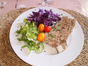 Chemiser le fond et les parois d'une terrine avec les bardes de lard, puis verser la préparation en tassant bien. Décorer le dessus avec des morceaux de barde de lard et quelques feuilles d'estragon.