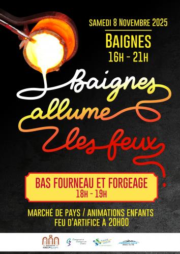 Le 08/11/2025 à Baignes BAIGNES ALLUME LES FEUX La fête du fer à Baignes le samedi 8 novembre sera l'occasion de faire connaissance avec la sidérurgie de la préhistoire. Dès 16 heures vous pourrez observer le fonctionnement d'un bas fourneau tout en profitant d'un marché de pays très diversifié. Ensuite vous assisterez à l'extraction du fer et à son affinage par les forgerons des « Marteaux de Maillet ». Un livret sera remis aux enfants pour la compréhension de cette opération antique. Feu d'artifice aux alentours de 20h Contact : 03 84 78 82 44 ou 06 22 17 22 68 Entrée gratuite Lieu : Forges de Baignes |