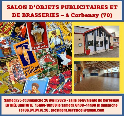| Du 25/04/2026 au 26/04/2026 à Corbenay Salon d'objets publicitaires et de brasseries à Corbenay Plongez au c½ur de l’Art Publicitaire ! Nous vous offrons une opportunité exceptionnelle de redécouvrir les trésors qui ont marqué les époques : plaques émaillées, affiches rares, boîtes anciennes, automates et présentoirs iconiques. Venez échanger avec des dizaines de collectionneurs venus de toute les régions de France et d'Europe et profitez d'une pause rafraîchissante à notre buvette. Une journée placée sous le signe de la passion et de la découverte Lieu, salle polyvalente Entrée gratuite tout au long du weekend Horaires visiteurs de 15h00 à 18h30 le samedi et de 6h30 à 14h00 le dimanche Site internet : http://brassicol.fr |
