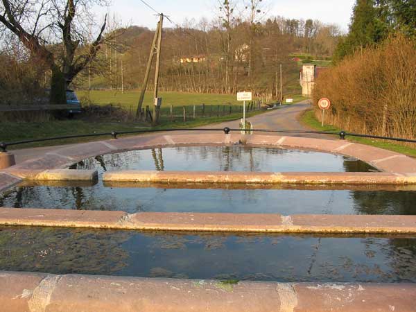 Mais c'est surtout la fontaine de grès rose (construite en 1888-1889) qui est intéressante, par ses dimensions tout d'abord : elle est composée de deux bassins, dont l'un de 8 mètres de long, de trottoirs de 1,30 mètres de large, et elle est bordée d'une banquette en pierre de taille. Les matériaux de construction participent à la beauté de cette fontaine monumentale : pierre de taille, grès dur de Luxeuil, calcaire de Colombe... La fontaine fonctionne toujours aujourd'hui.