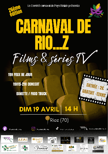 | Le 19/04/2026 à Rioz Retour du carnaval de Rio... Z Retour du carnaval de Rio... Z, sur le thème "films et séries TV", le dimanche 19 avril à Rioz dès 14h. Entrée 2¤, gratuit -12 ans. Thème 2026 : Films et séries TV Héros cultes, univers mythiques, personnages légendaires ... Sortez les costumes, le tapis rouge est déroulé ! Temps fort de la soirée : - 19h : un clin d'oeil pyrotechnique en plein jour Le feu d'artifice de jour est un clin d'½il visuel d'une minute, avant de laisser place à la suite des animations. - 19h15 : Ambiance live avec les Voleurs de sons Sur place toute la journée : buvette, food trucks et vente de confettis pour faire la fête jusqu'au bout ! Présence d'un manège et d'animations de loisirs Site internet : https://tourisme7rivieres.fr |