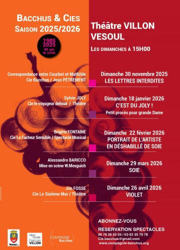 | Le 29/03/2026 à Vesoul SOIE - Alessandro BARICCO SOIE Alessandro BARICCO Mise en scène W. Mesguich -Théâtre Une invitation au voyage et à l'amour, traversée par les fulgurances d'Alessandro Baricco, l'auteur de NOVECENTO. "Un merveilleux hommage au roman, d'une beauté rare" Adaptation et jeu : Sylvie Dorliat Création lumière : William Mesguich Création sonore : David van Tongerloo Création video : Karine Zibaut Prenez vos billets ici BILLETTERIE HELLO ASSO SOIE 29 mars 2026 Théâtre VILLON VESOUL Tarif normal 15¤ / Réduit 12 ¤ / Abonnement 5 spectacles 60¤ ABONNEMENT SAISON 2025 2026 THEATRE VILLON VESOUL 5 SPECTACLES RESERVATION / INFORMATIONS Compagnie BACCHUS - 06 76 28 53 04 - cie.bacchus@gmail.com ABONNEZ VOUS ! SAISON 2025 2026 / 5 SPECTACLES 60¤ LES DIMANCHES A 15H Théâtre Villon VESOUL Site internet : https://www.compagnie-bacchus.org/f... |