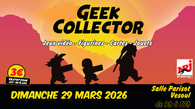 | Le 29/03/2026 à Vesoul Geek Collector - Vesoul #6 Nouveau salon des geeks collectionneurs à Vesoul. Découvrez des exposants venus de toute la France. Jeux vidéos, figurines, cartes de collection, jouets, répliques d’armes, posters, mangas, produits dérivés et un grand espace retrogaming en libre accès. Salle Parisot de 9h à 17h. |