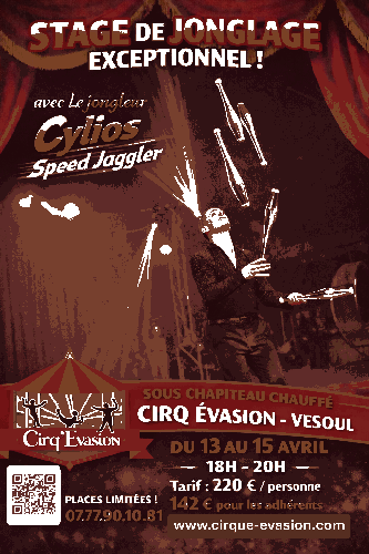 | Du 13/04/2026 au 15/04/2026 à Vesoul Worhshop Jonglage 🎪✨ STAGE DE JONGLAGE EXCEPTIONNEL À VESOUL ! ✨Envie de repousser tes limites, de gagner en vitesse, précision et fluidité ? Cirq’Évasion t’invite à un workshop unique avec Cylios – Speed Juggler, artiste de renommée internationale 🔥 📅 Du 13 au 15 avril 🕕 18h – 20h 📍 Sous chapiteau chauffé – Cirq’Évasion, Vesoul 🔹 3 séances intensifs 🔹 Travail technique, rythme, vitesse et coordination 🔹 Accessible aux jongleurs motivés (ados / adultes) 🔹 Groupe limité – places très restreintes 💰 220 ¤ / personne 💛 142 ¤ pour les adhérents 📲 Infos & inscriptions : 📞 07 77 90 10 81 🌐 www.cirque-evasion.com ⚠️ Places limitées – ne rate pas cette occasion unique ! Viens vivre le cirque de l’intérieur 🎭✨ Site internet : http://www.cirque-evasion.com/inscr... |